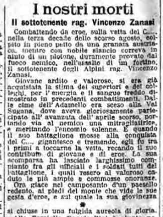 Vincenzo Zanasi, nato nel 1896 a Bologna, Sottotenente nel 4° Rgt. alpini, caduto il 25 agosto 1916