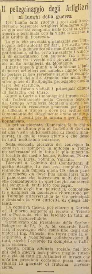 E' opportuno ricordare che per Statuto solo gli alpini potevano iscriversi all'Ass. Naz. Alpini, gli artiglieri da montagna, non riconosciuti "alpini" avevano costituito nel dicembre 1921 con sede a Genova una loro associazione, l'A.N.A.M. (Ass. Naz. Artiglieri da Montagna). La questione viene risolta nell'aprile 1929 dal nuovo Presidente Nazionale imposto