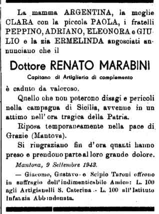 Ancora una volta sono "sorpreso" nel constatare quante belle figure emergono continuamente dal passato nel corso delle continue ricerche sugli "alpini" del nostro territorio, come questa rintracciata l'8 febbraio 2023 : è il Capitano di artiglieria da montagna (artiglieria alpina) Renato Marabini, caduto combattendo a difesa della stazione ferroviaria di Mantova all'arrivo delle truppe tedesche d'occupazione il 9 settembre 1943 (il giorno dopo il drammatico 8 settembre). Ricorrendo anche l'80° anniversario da quei drammatici avvenimenti, ne rinnovo la memoria ed il ricordo e lo ricolloco oggi nella storia degli alpini bolognesi romagnoli “per non dimenticare” evidenziando che fra l'altro è stato il primo "alpino" nato nel nostro territorio caduto nella Resistenza ed anche il primo decorato al valor militare.