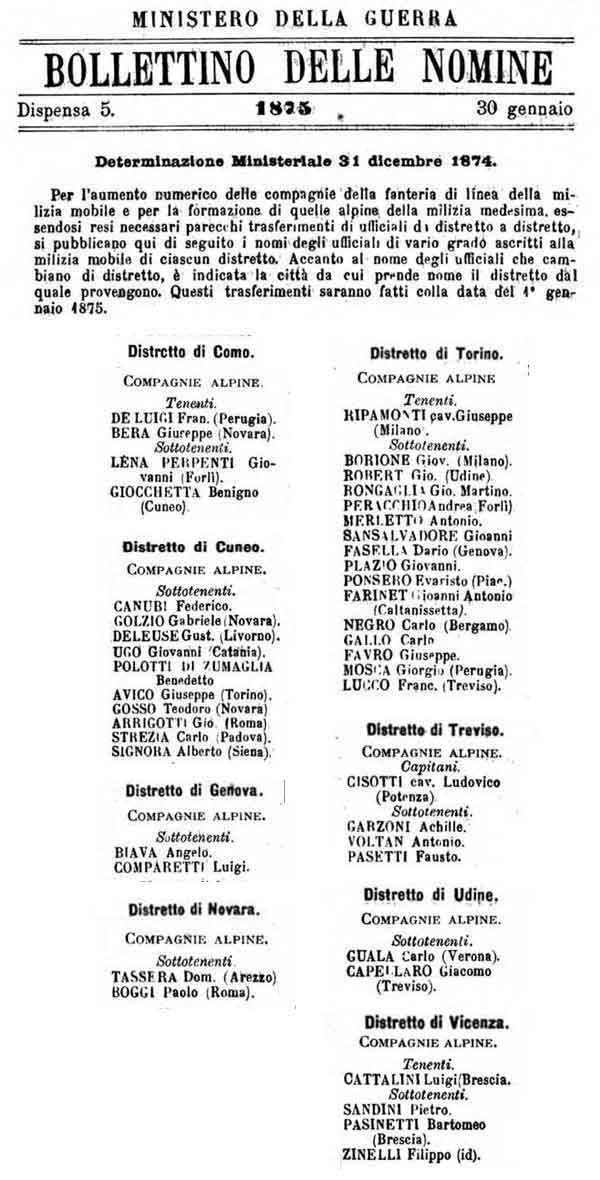 Sulla Gazzetta Ufficiale del 21 febbraio 1873 viene pubblicata la Determinazione Ministeriale del 17 febbraio con la quale nascono ufficialmente i primi quattro Reparti Alpini ai quali sono assegnate le 15 compagnie alpine di nuova formazione che risultano così formalmente costituite ed entrano nell'organico operativo del Regio Esercito dal 5 marzo 1873.